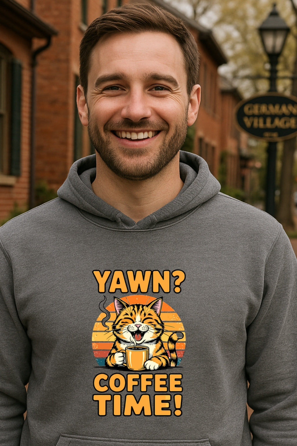 Stay cozy and stylish with this Coffee Time Yawning Cat Hoodie. Perfect for cat lovers and coffee enthusiasts, this funny retro sunset design will add a touch of humor to your wardrobe. Ideal for fall, this hoodie is a great gift for cat moms and dads. Whether you're lounging at home or heading out for a coffee run, this hoodie is a must-have for any cat lover's collection.