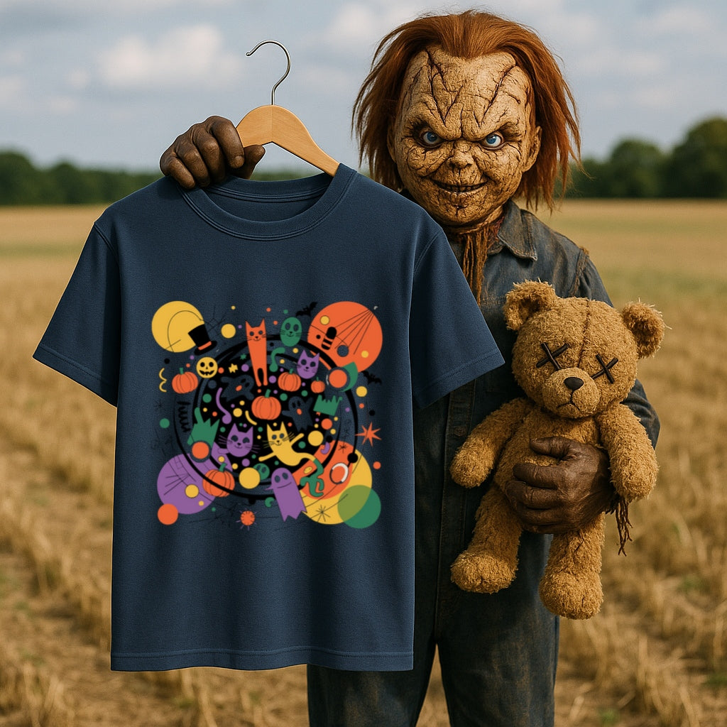 Colorful Halloween Cats & Ghosts Party Tee – Fun Abstract Spooky T-Shirt for Cat Lovers & Halloween Fans. Bring the party vibes to Halloween night with this bold and playful tee. Featuring a swirl of colorful cats, cheeky ghosts, pumpkins, and spooky shapes, this design is more fun than fright. Perfect for Halloween parties, trick-or-treating, or just showing off your spooky spirit in style. A unique mix of spooky and artsy — this shirt will have people asking, “Where did you get that?”