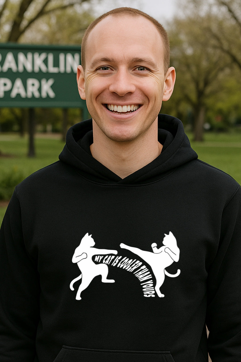 Stay cozy and stylish with our Karate Cats Hoodie featuring a hilarious design of two karate cats mid-fight and the bold phrase 'My Cat Is Cooler Than Yours'. This lightweight and soft hoodie is perfect for cat lovers, martial arts fans, and anyone with a sense of humor. It makes a great everyday piece for casual wear or a unique gift.