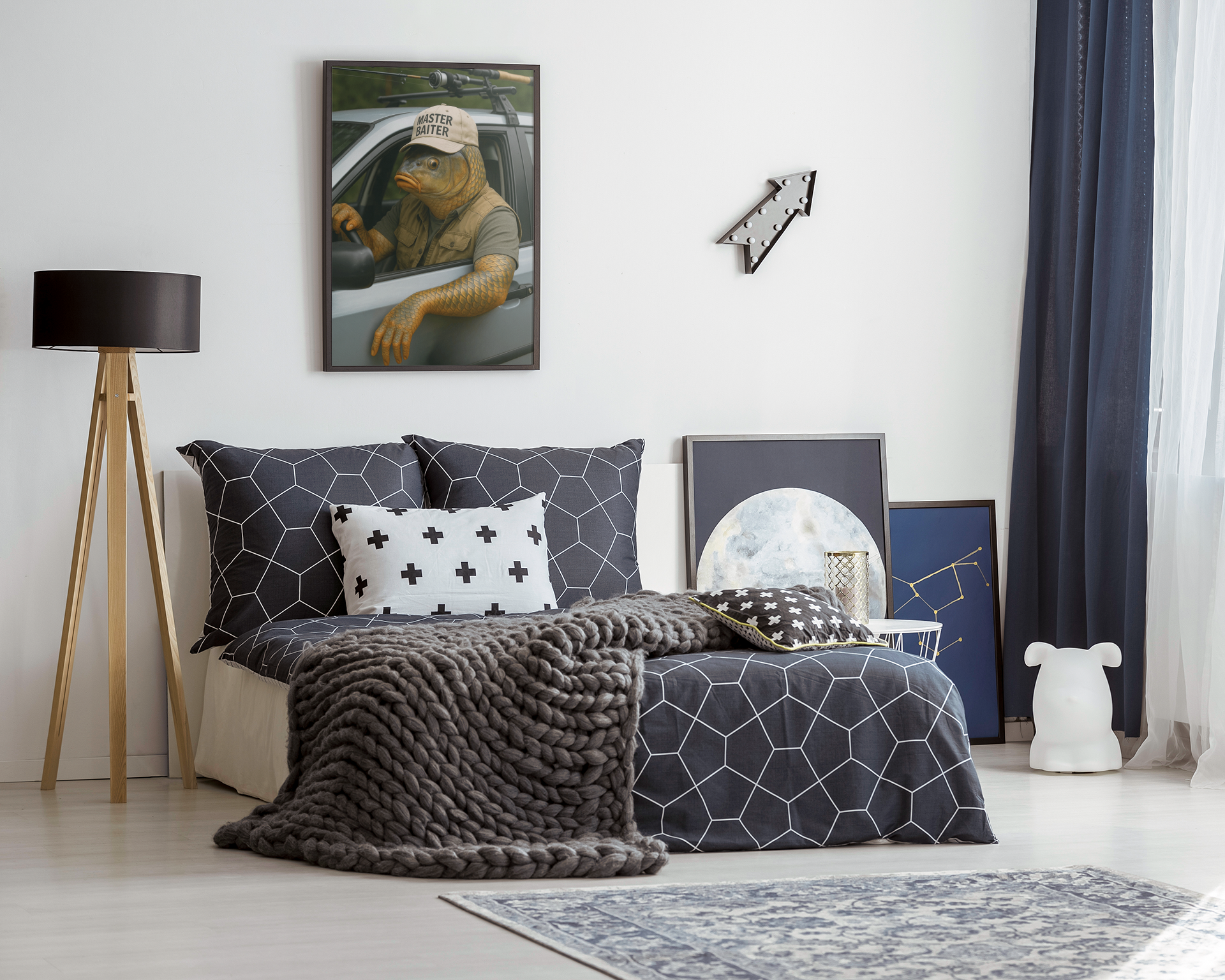 This surreal wall art features the world’s grumpiest fish-man behind the wheel — poles strapped to the roof, deadpan face locked in, headed straight for destiny (and probably a six-pack).