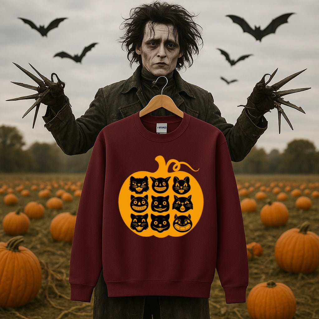 Cozy and bold Nine Lives Pumpkin Halloween Sweatshirt featuring nine mischievous black cats inside a glowing orange jack-o’-lantern Perfect for cat lovers, Halloween collectors, retro art fans, or anyone looking for spooky style this fall