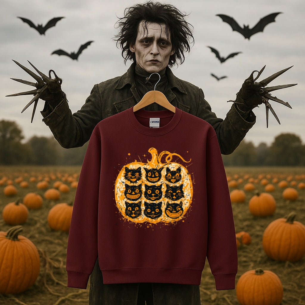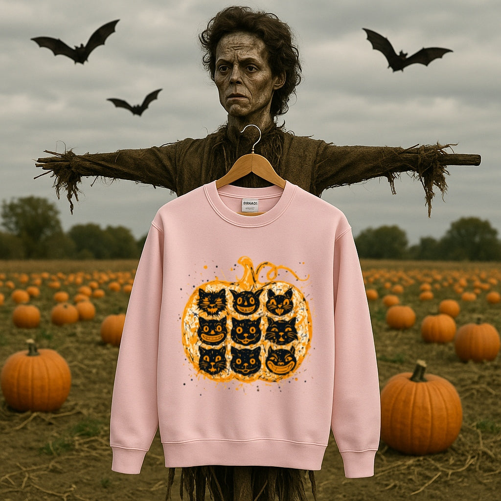 Nine Lives Pumpkin Sweatshirt - Pollock Style Halloween Cats - Abstract Drip Art Jack O Lantern, Unisex Sweatshirt for Artists and Cat