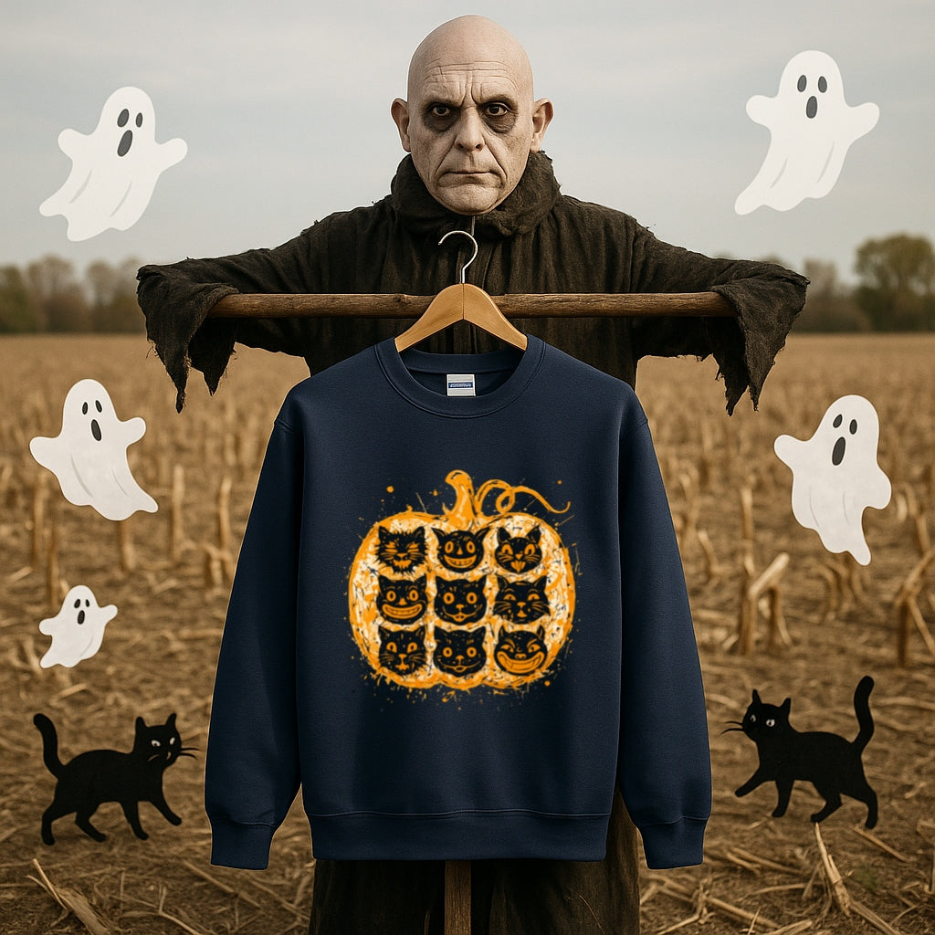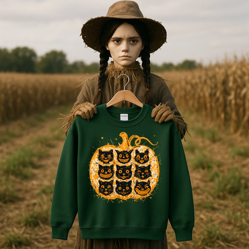 Embrace a chaotic beauty with this Nine Lives Pumpkin Sweatshirt featuring a Pollock-style Halloween design. Perfect for artists, cat lovers, and Halloween fans, this cozy crewneck is made for fall nights. The abstract splashes of color and mischievous cats inside a jack-o’-lantern create a unique and artistic vibe.