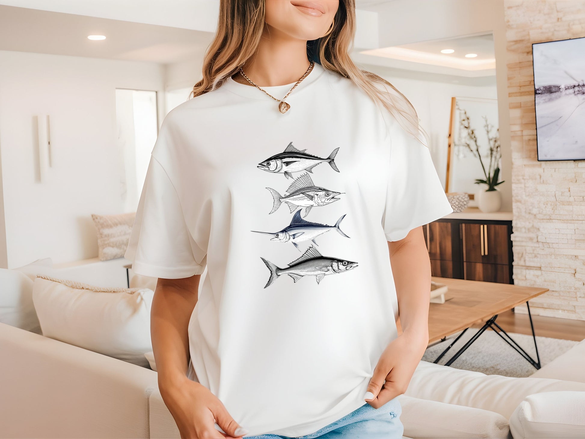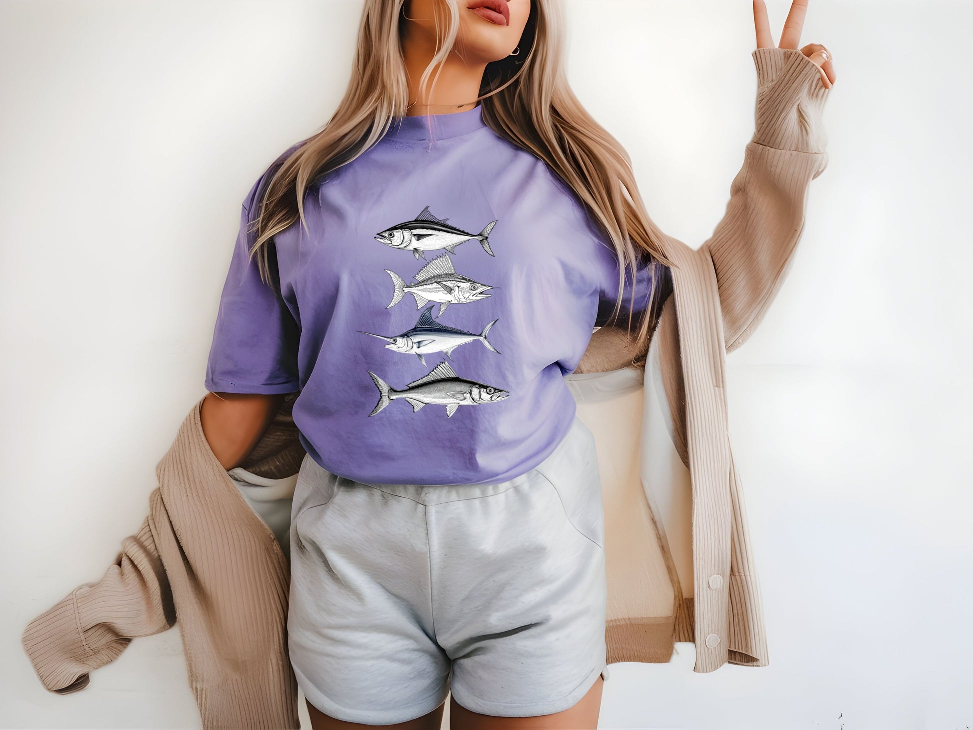 Hooked on saltwater style? This retro hand-drawn fishing tee features iconic ocean predators—Mahi Mahi, Yellowfin, Marlin, and Barracuda—etched in vintage ink on soft Comfort Colors®—a must-have for serious sea lovers and offshore anglers.