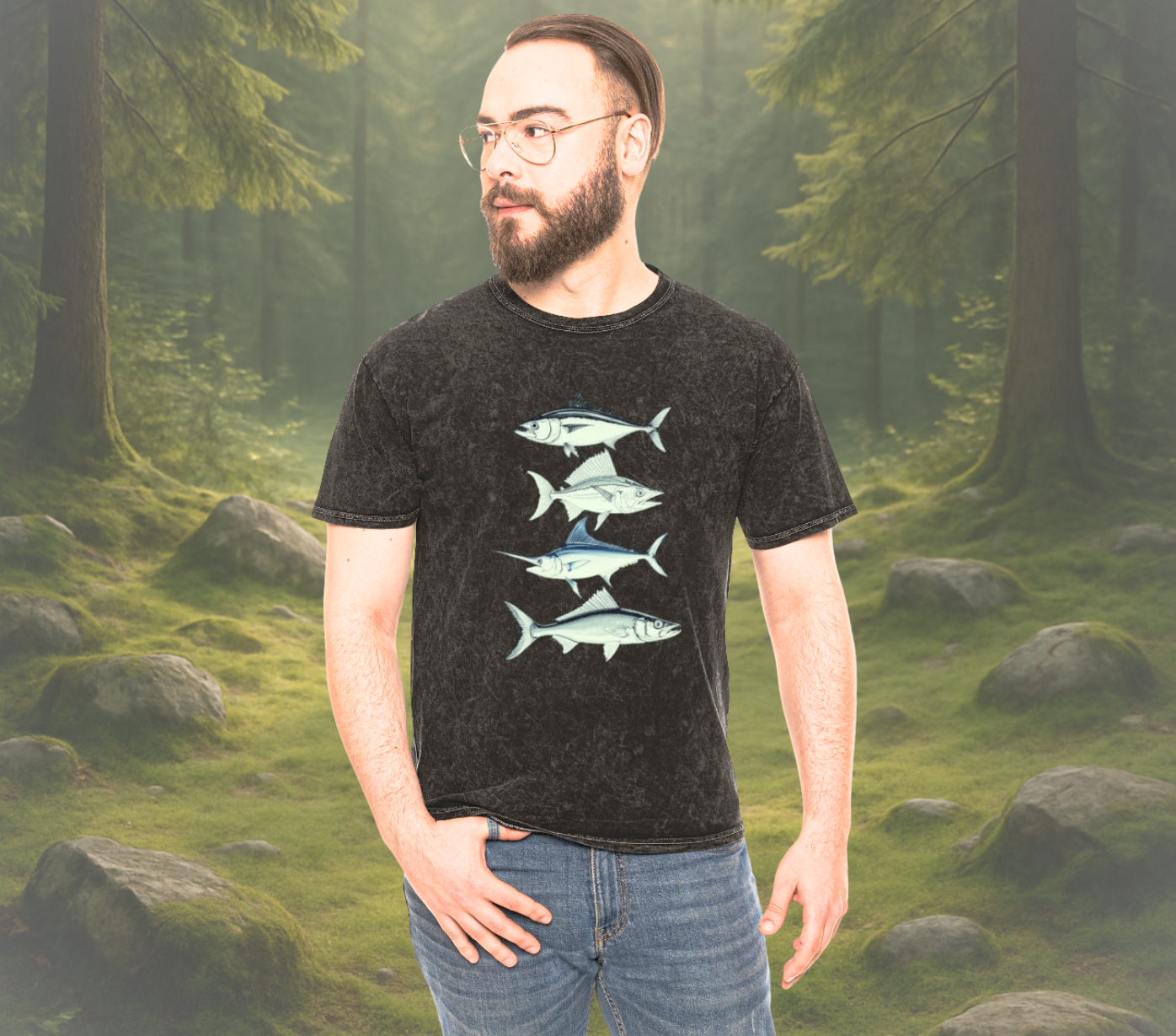 Hooked on style? This unisex saltwater fishing tee features four legendary species — Mahi Mahi, Yellowfin Tuna, Marlin, and Barracuda — in crisp vintage ink on a soft mineral wash shirt. Whether you're casting lines or just chilling dockside, it's the perfect catch for anglers and ocean lovers of all kinds.