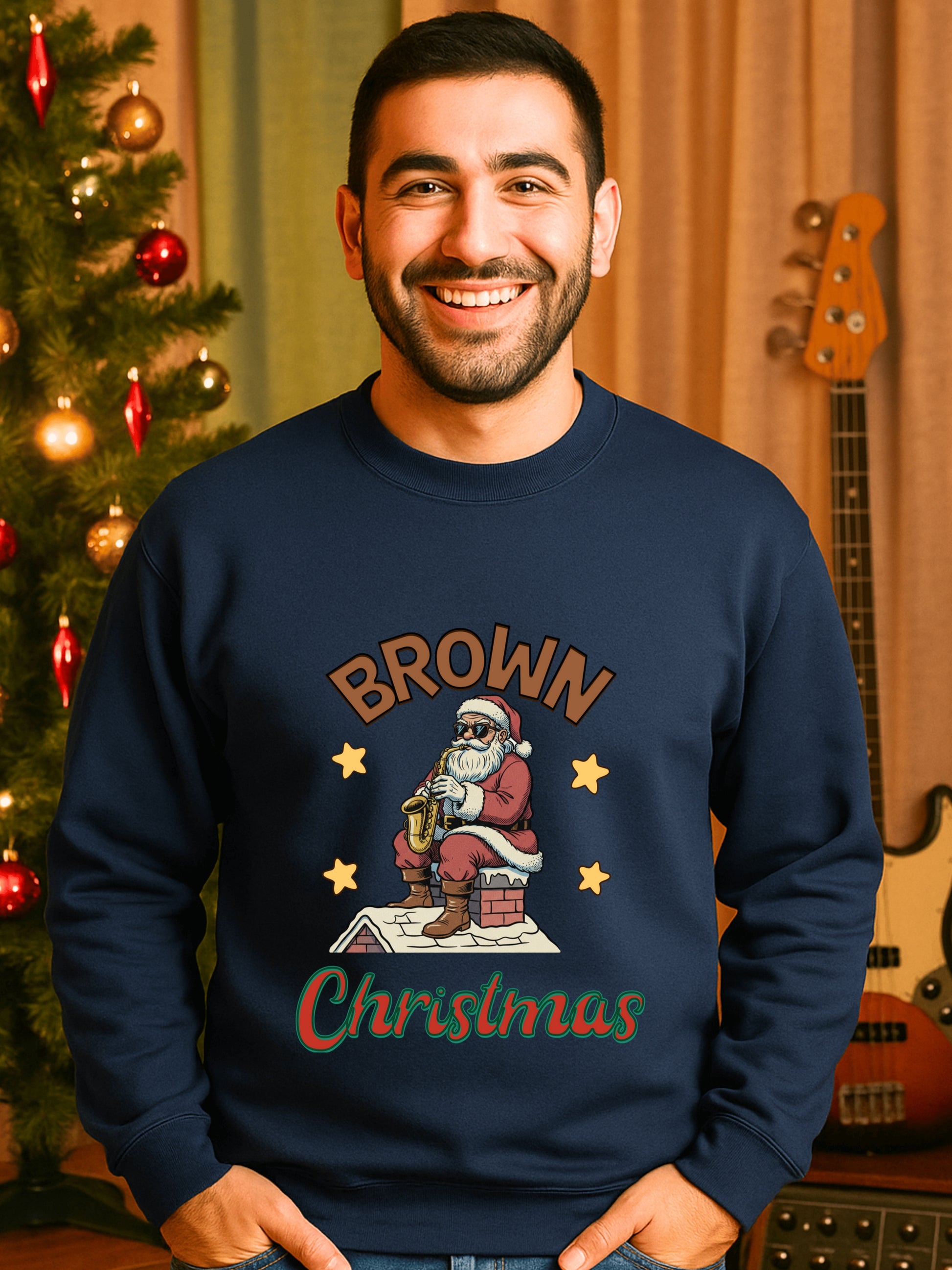 This vintage-inspired crewneck mixes holiday warmth with a wink of mischief. A retro Santa lounges on a chimney, saxophone in hand, bringing laid-back jazz to yuletide gatherings. It settles into holiday parties and casual jam sessions alike—soft against the skin and roomy enough for layered outfits. Wear it when you want to spark laughs at an ugly-sweater party, trade riffs with fellow musicians, or simply keep the season lighthearted during office celebrations. The brown, slightly distressed artwork reads like a found poster from a club holiday gig, giving the sweatshirt a lived-in, nostalgic vibe that musicians and comedy-minded friends will appreciate.