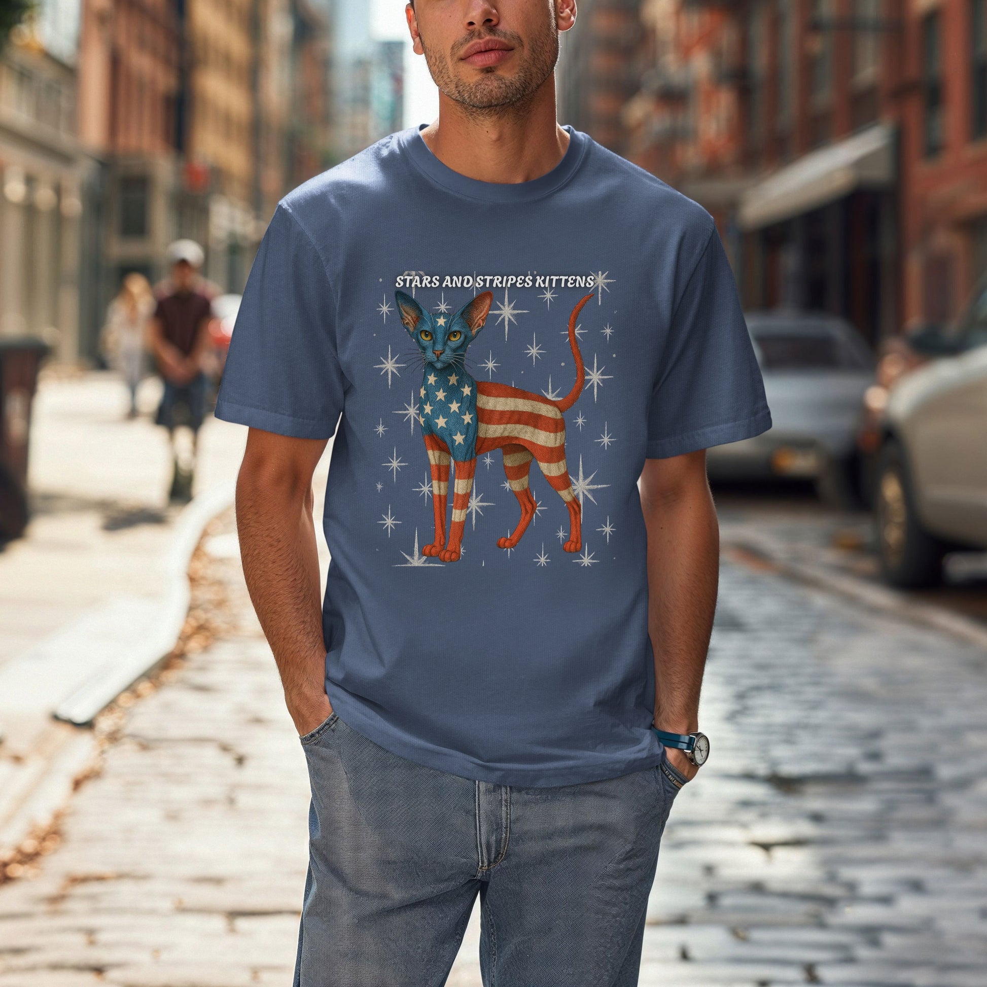 Stars and Stripes Cat Unisex Tee Funny USA Flag Kitty Graphic Tee Patriotic Cat Shirt for 4th of July Oriental Shorthair Cat Lovers Gift