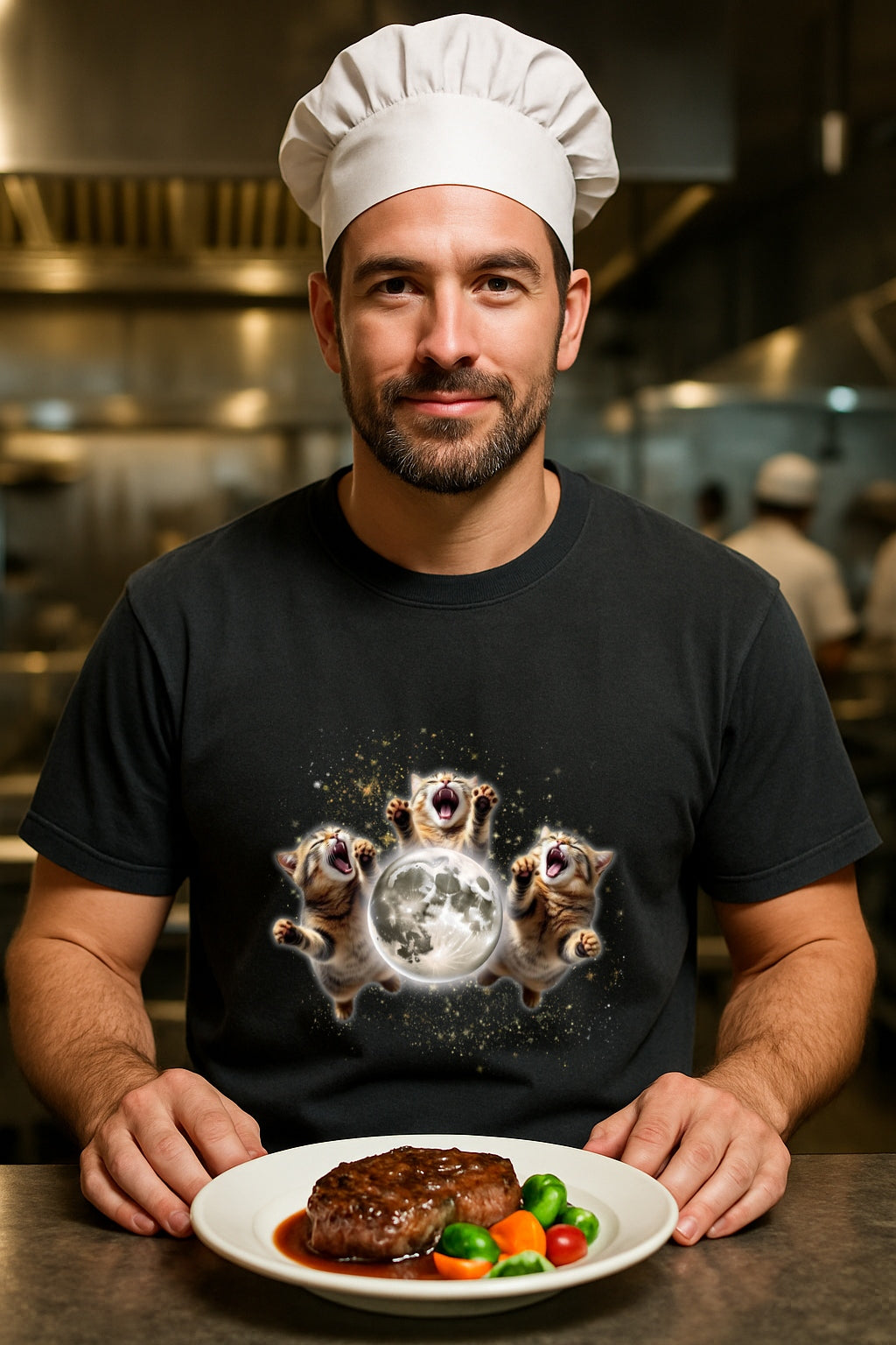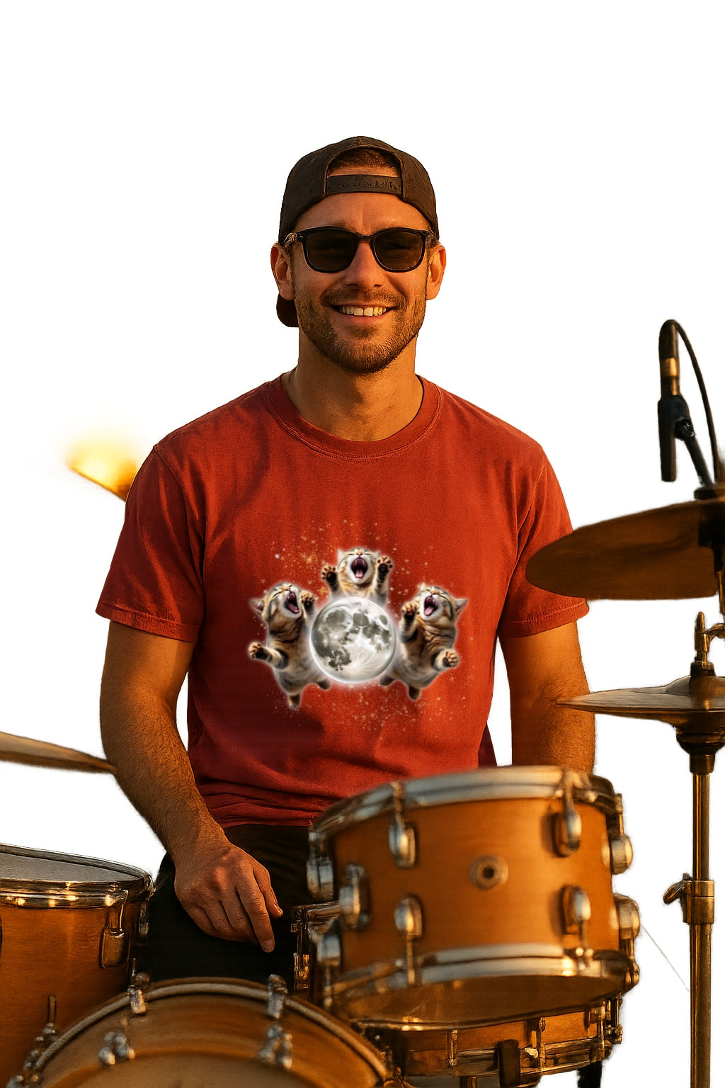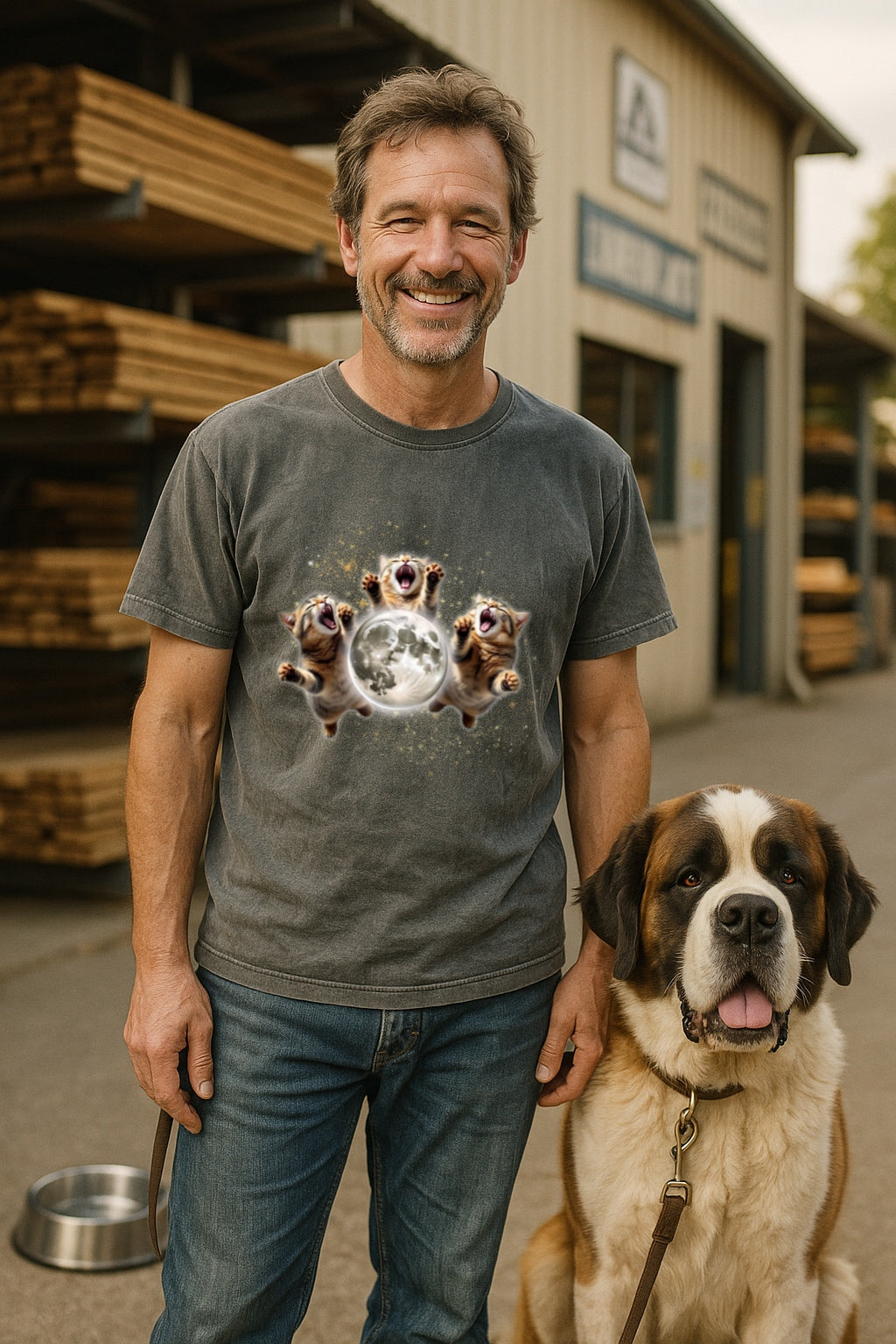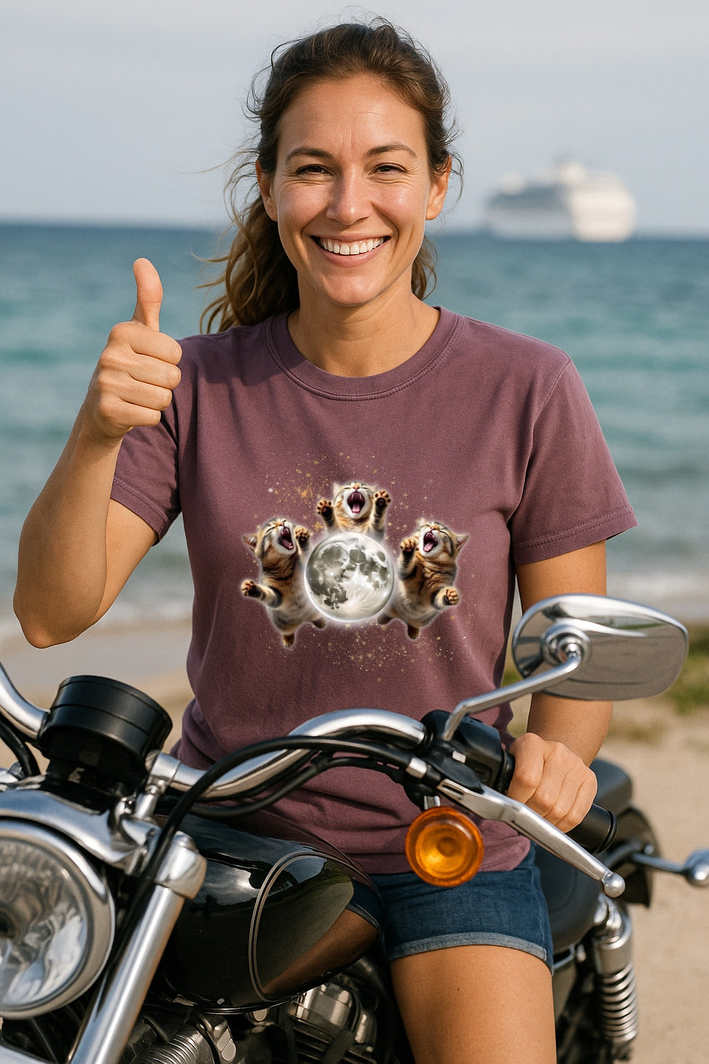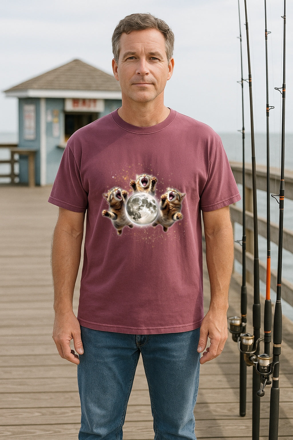 This hilarious tee features three dramatic cats howling at the moon in full vintage glory. Perfect for cat lovers, moon worshippers, or anyone who thrives on weird energy. Printed on soft, washed cotton.