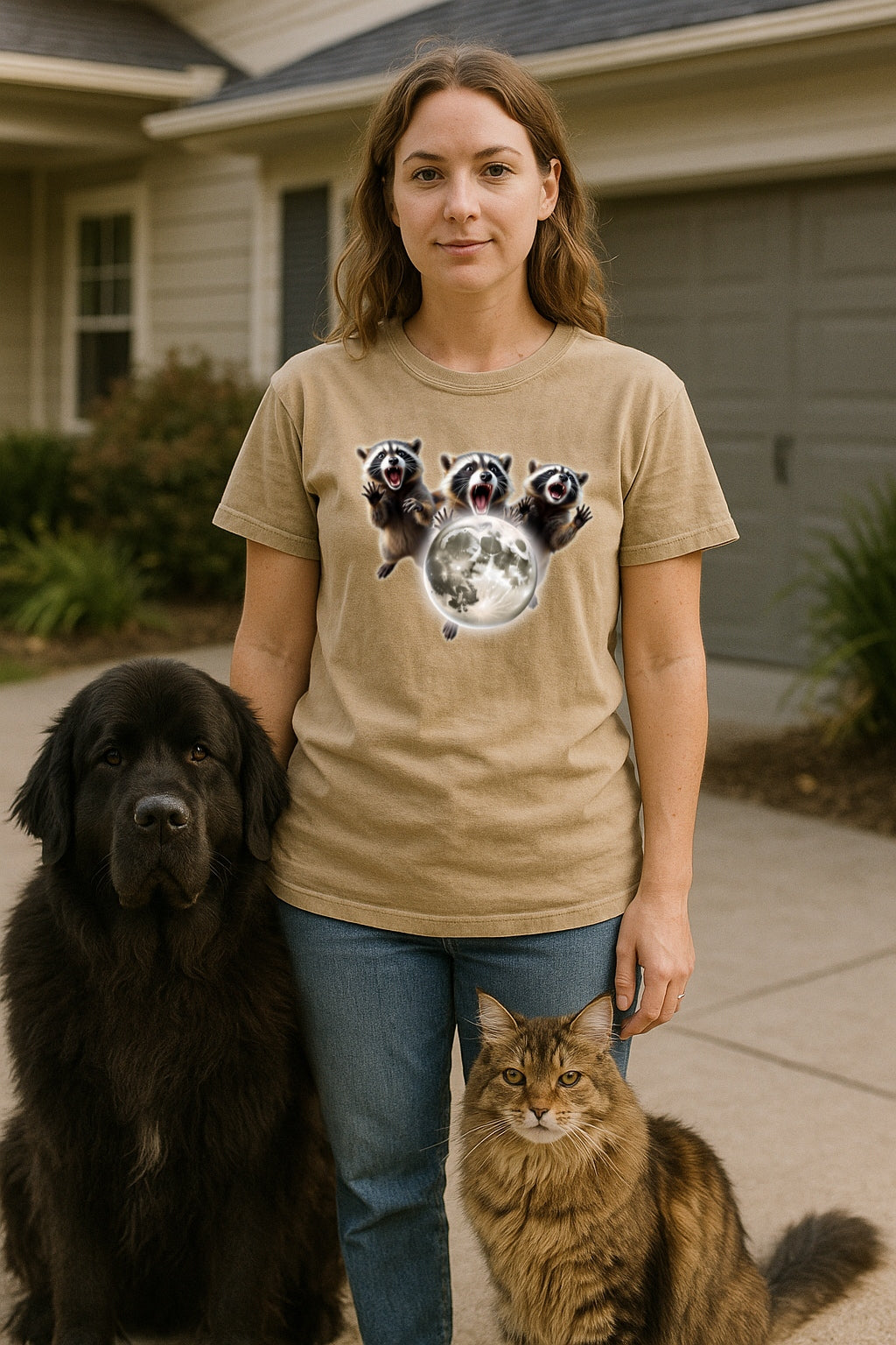 Join the midnight ceremony of the raccoon cult! With paws raised in cosmic reverence, these three trash pandas summon the moon in this hilarious and weirdly majestic design. For animal lovers, moon watchers, and anyone who’s ever howled at the universe in style.
