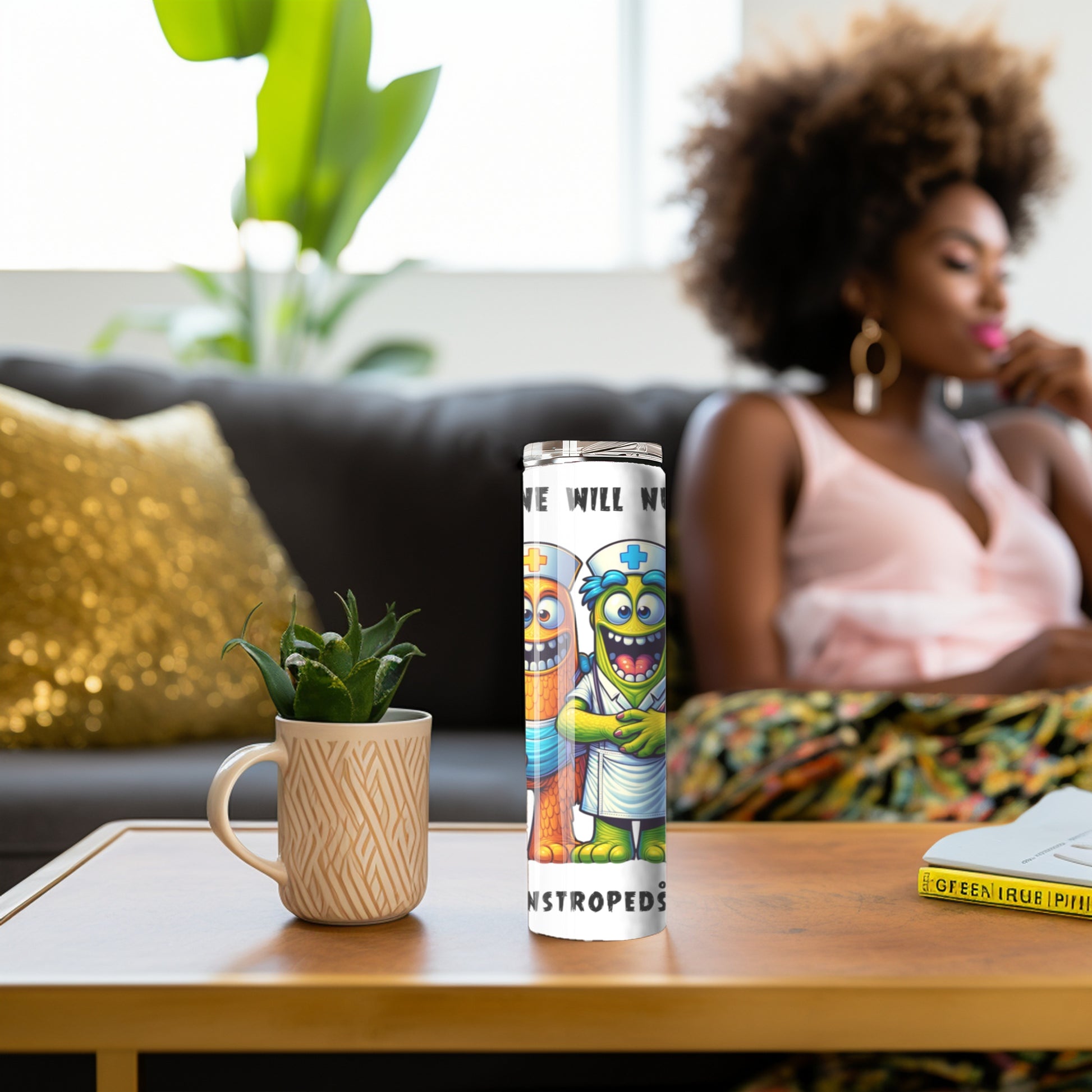Steel Tumbler 20oz. - Funny Medical Pros - Monstropeds™ in We Will, We Will Nurse You -Cartoon Doctor Unisex Sarcastic T-Shirt for Adults